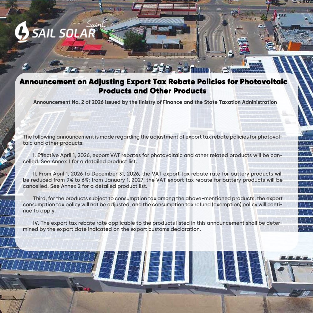 في 8 يناير 2026، أعلنت وزارة المالية الصينية رسميًا إلغاء إعفاءات ضريبة القيمة المضافة على صادرات الألواح الشمسية، مع تخفيض معدل إعفاء ضريبة القيمة المضافة على بطاريات الليثيوم. لا ينبغي للمشترين الأجانب تفويت هذه الفرصة!