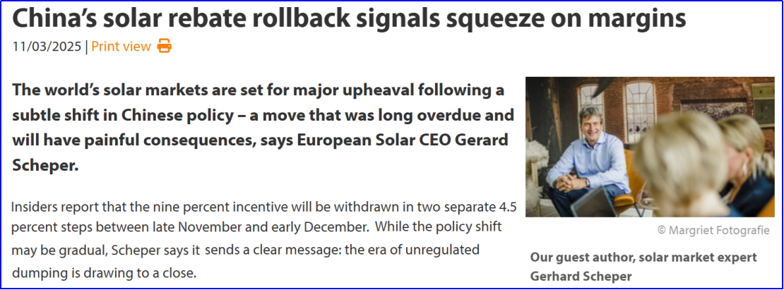 ذكر تقرير شركة PV Europe الصادر في 3 نوفمبر/تشرين الثاني أن السلطات الصينية كانت تخطط في البداية لتحديد شهر سبتمبر/أيلول موعدًا نهائيًا لإلغاء سياسة استرداد ضريبة التصدير لمنتجات الطاقة الشمسية، إلا أن المصنعين سارعوا إلى اتخاذ الإجراءات اللازمة، حيث زادت المصانع إنتاجها، وملأت المستودعات، وصدّرت المنتجات قبل انتهاء أجل السياسة. وصرح جيرارد شيبر، الرئيس التنفيذي لشركة European Solar، قائلاً: "كانوا يُحمّلون الشاحنات ويُسارعون إلى التصدير، مُستغلين آخر قطرة ربح من السياسة القديمة".