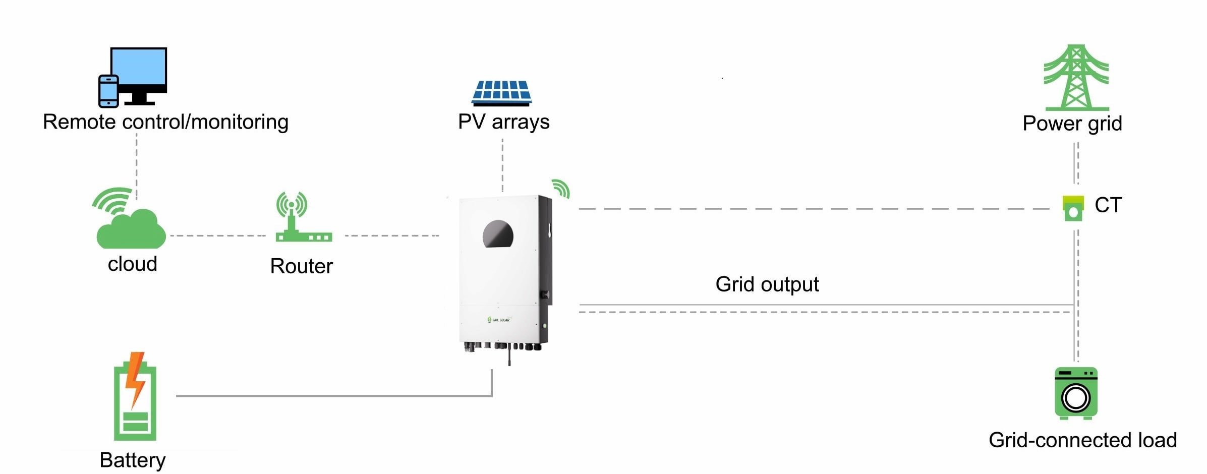 بالإضافة إلى ذلك، يدعم هذا العاكس مجموعة متنوعة من أوضاع التشغيل وتكوينات النظام، لذا سواء كنت ترغب في تحسين نظام الطاقة الشمسية المتصل بالشبكة في منزلك، أو ترقية نظام الطاقة الاحتياطي المستقل عن الشبكة في مزرعتك، فإن هذا العاكس قادر على التعامل مع مجموعة واسعة من تطبيقات الطاقة المنزلية. يمكنك تلبية احتياجاتك من الطاقة وحماية منزلك من شبكات الكهرباء غير المستقرة وانقطاعات التيار الكهربائي المتكررة، مع تحقيق وفورات هائلة شهريًا في فاتورة الكهرباء.