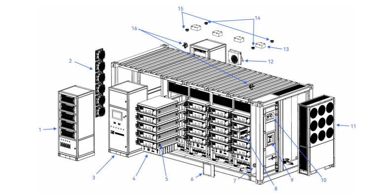 أكثر من 9 محولات طاقة ثنائية الاتجاه معيارية (PCS)، تحتوي الحاوية على خزانتين لمحولات الطاقة، بإجمالي 9 محولات طاقة بقدرة 125 كيلوواط. كل محول طاقة متصل بمجموعة بطاريات واحدة ويتحكم في شحن وتفريغ هذه المجموعة.