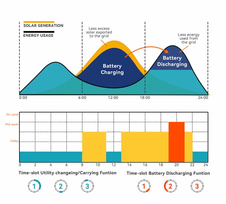 يتميز هذا العاكس الشمسي بخاصية الشحن والتفريغ المؤقت. يمكن للمستخدمين تحديد فترات شحن وتفريغ مختلفة وفقًا لسعر الاستخدام المحلي، مما يوفر استهلاكًا معقولًا للطاقة الكهربائية الرئيسية والطاقة الكهروضوئية. عندما تكون تكلفة الطاقة الرئيسية مرتفعة، يُستخدم عاكس البطارية لتزويد الحمل بالطاقة؛ وعندما تكون تكلفة الطاقة الرئيسية منخفضة، يُستخدم لتزويد الحمل بالطاقة وشحنه، مما يساعد المستخدمين على خفض تكاليف الكهرباء إلى أقصى حد.