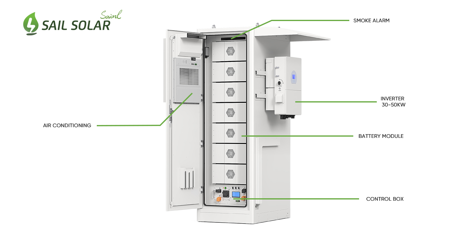 يُجهز نظام تخزين الطاقة الخارجي المتكامل هذا ببطارية ليثيوم أيون سعتها 100 كيلوواط/ساعة، ومحول طاقة هجين اختياري من نوع Deye/Solis بقدرة 30-50 كيلوواط لإدارة موثوقة للطاقة. ويضمن تنظيم الجهد وموازنة التيار ثلاثي الأطوار استقرار الشبكة، بينما يعمل نظام تبريد الهواء المتكامل، وآلية إخماد الحرائق، ونظام إدارة الطاقة المركزي معًا لضمان التشغيل الآمن والفعال للنظام بأكمله.
