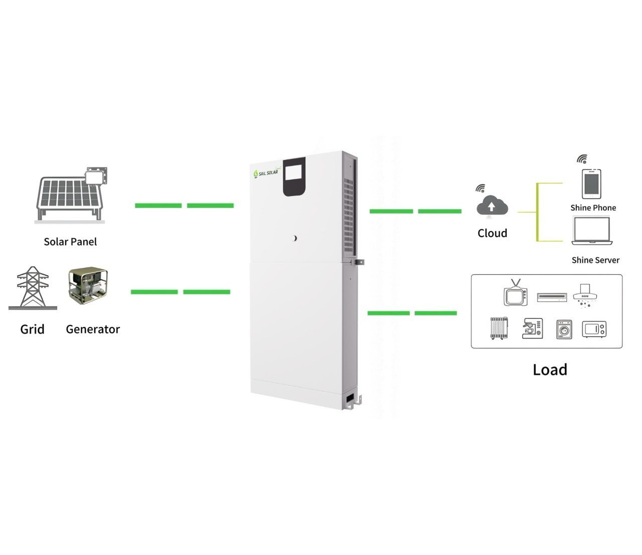 يعد Sail Solar ESS All-in-One 10000W حلاً لتخزين الطاقة عالي الأداء يجمع بين عاكس الطاقة الشمسية وتخزين البطارية وقدرات إدارة الطاقة الذكية في نظام واحد مضغوط.